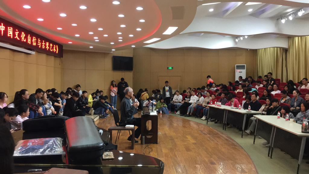 讲座开始后,艺术学院东厅热闹非凡、座无虚席。现场200多名学生及琴友聆听了吴钊先生的讲座。吴钊先生从古琴文化艺术展开,围绕“中国文化自信与古琴艺术”对中国传统音乐文化进行解读,进一步加深当代人们对传统音乐文化的认识。
